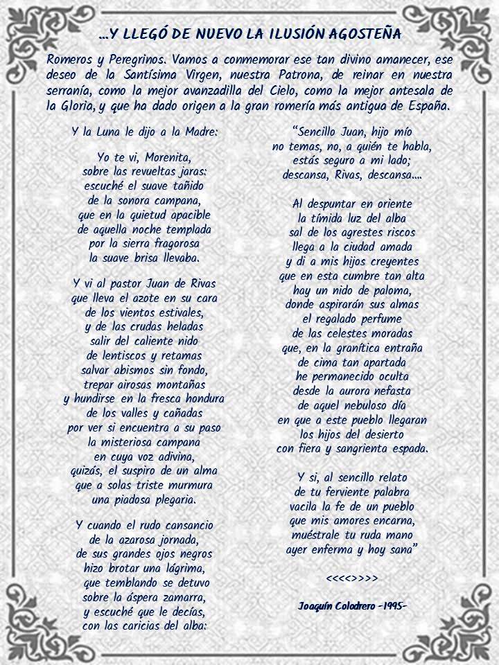 Y LLEGÓ DE NUEVO LA ILUSIÓN AGOSTEÑA Fragmento de la obra “Y LLEGÓ DE NUEVO LA ILUSIÓN AGOSTEÑA” de Joaquín Colodrero en conmemoración de la Aparición. Año 1995. <<<<<>>>>>