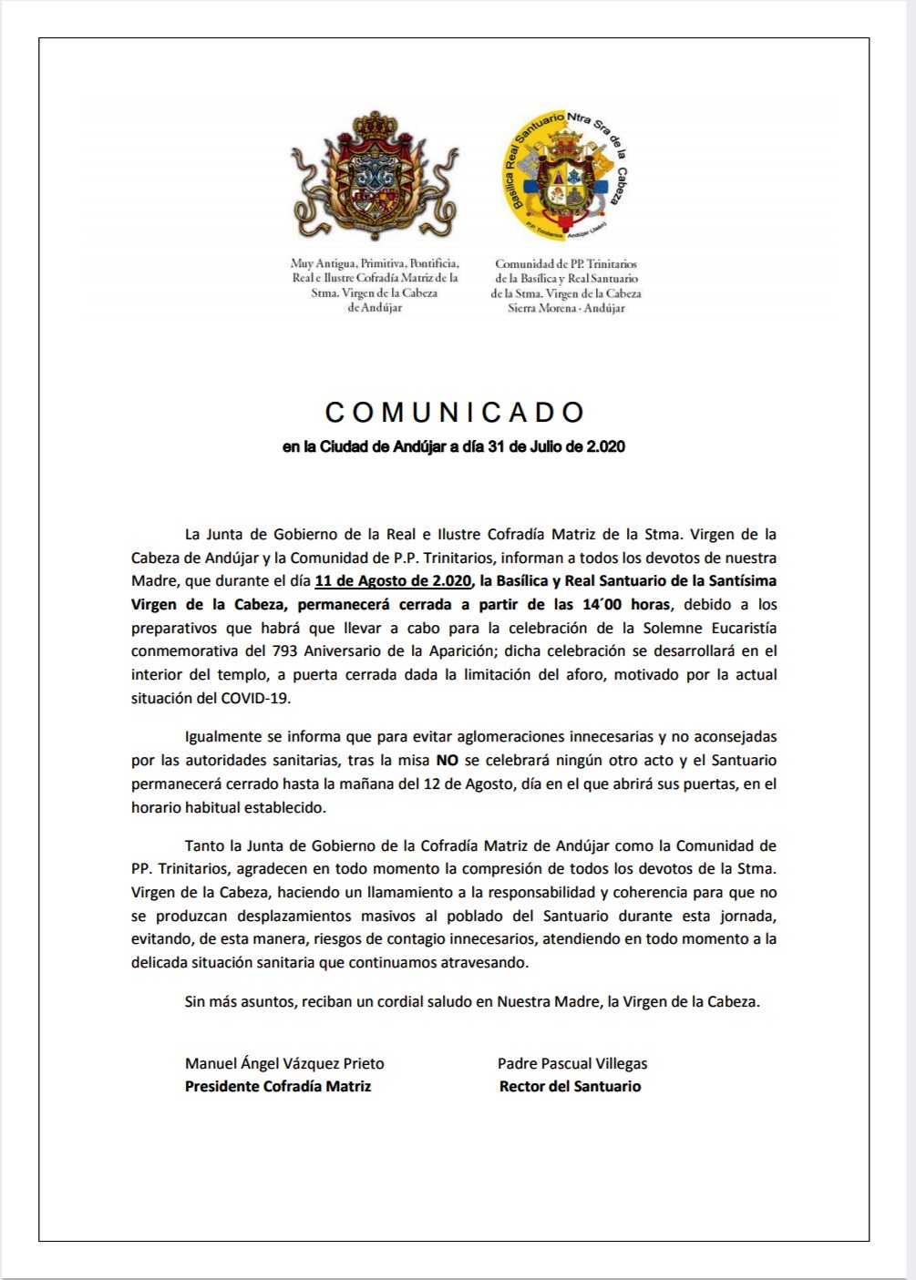 - COMUNICADO - CELEBRACIÓN DE LA SOLEMNE EUCARISTÍA CONMEMORATIVA DEL 793 ANIVERSARIO DE LA APARICIÓN SANTUARIO, AGOSTO 2020