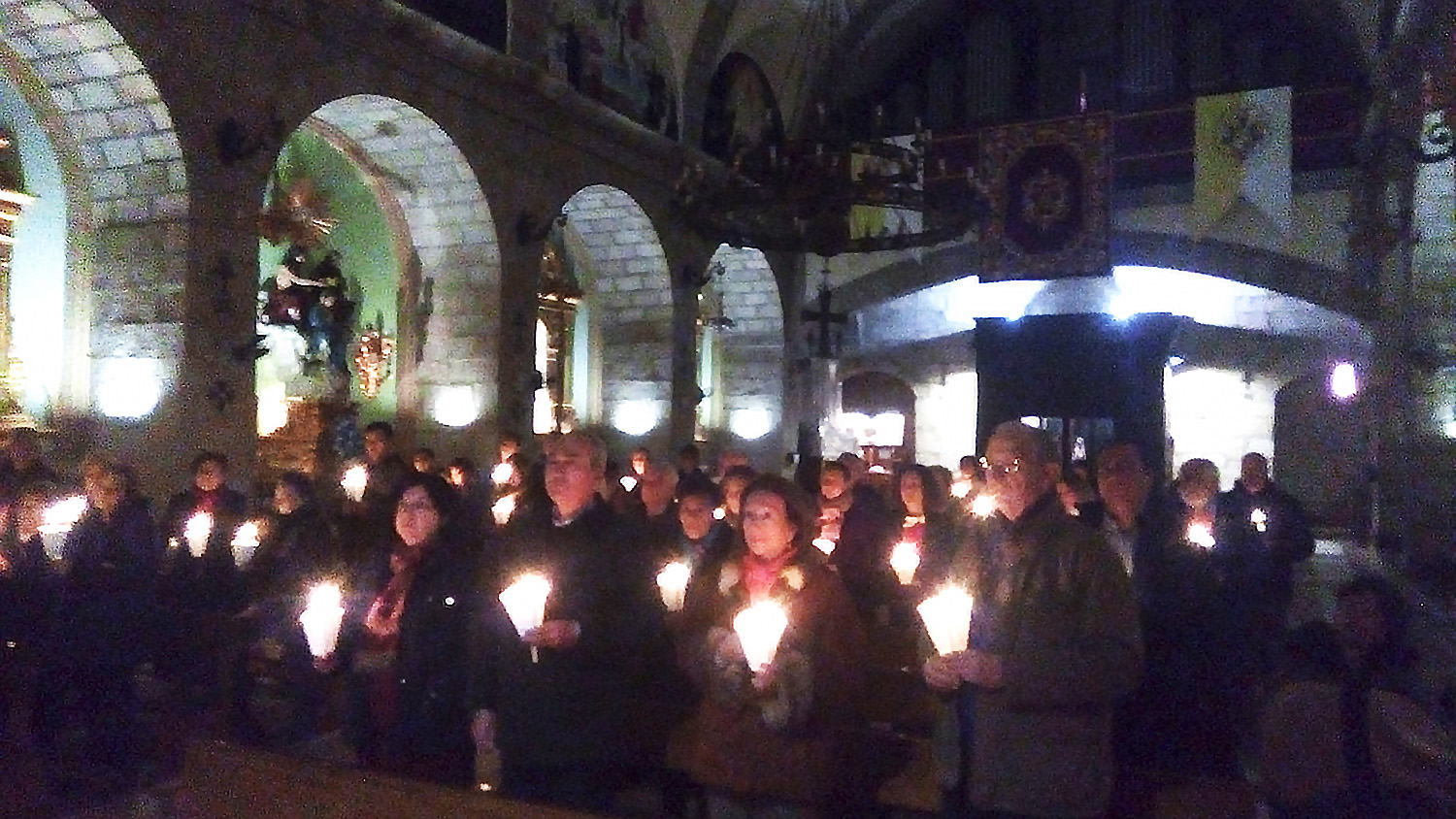 Se bendijo el fuego en la lonja del santuario. El Párroco con un punzón traza una cruz, sobre el cirio. Luego marcó en la parte superior la letra Alfa y en la inferior omega, entre los brazos de la cruz marcó las cifras del año en curso. los fieles encendieron su vela y en procesión entramos en la Basílica, cantando LUZ DE CRISTO, los fieles respondieron, DEMOS GRACIAS A DIOS.
